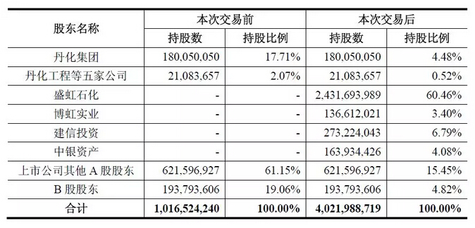 交易前,丹化科技實控人為江蘇省丹陽市人民政府,持股比例19.79%,斯爾邦隸屬盛虹集團。交易完成后,丹化科技將持有斯爾邦100%的股權,公司控股股東將變更為盛虹集團,實控人將變?yōu)榭姖h根、朱紅梅夫婦。
