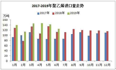 據(jù)統(tǒng)計(jì),2019年上半年P(guān)E進(jìn)口總量在813.1萬噸,較去年同期(694.1萬噸)增加119萬噸,增幅在17.14%。2019年P(guān)E進(jìn)口量仍處于增加走勢,主要原因是19年國外PE裝置擴(kuò)能更甚于國內(nèi),且國外PE輕烴裝置較多,聚乙烯成本較低,利潤可觀,使得聚乙烯更具價(jià)格優(yōu)勢。