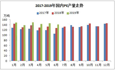 據(jù)統(tǒng)計(jì),2019年上半年國內(nèi)PE產(chǎn)量在867.21萬噸,較2018年同期(802.68萬噸)增加64.53萬噸,增幅在8.04%。2019年上半年國內(nèi)PE石化大修裝置較少,開工率較高在92%-98%之間波動。除此之外,內(nèi)蒙古久泰能源28萬噸/年全密度裝置在5月份順利投產(chǎn),6月份產(chǎn)量釋放產(chǎn)品逐步供應(yīng)市場。
