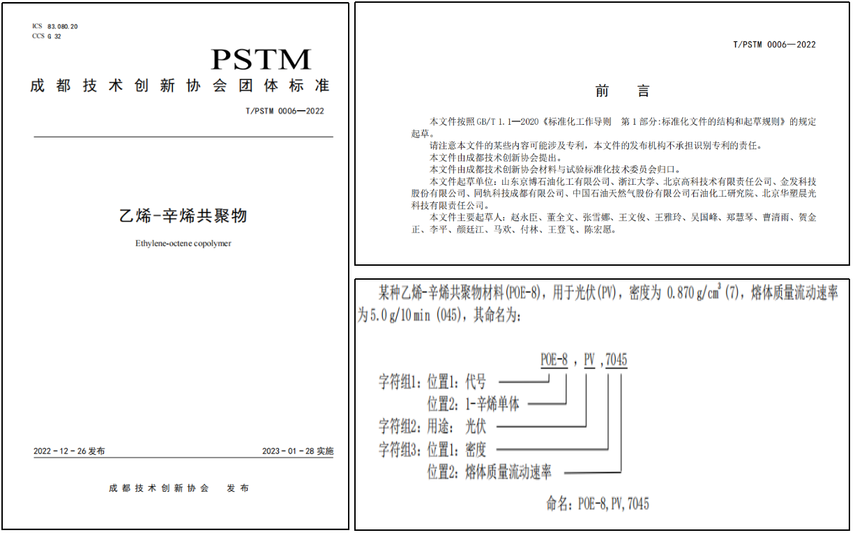 該標準由京博石化牽頭起草,由成都技術(shù)創(chuàng)新協(xié)會材料與試驗標準化技術(shù)委員會歸口,浙江大學(xué)、北京高科技術(shù)有限責(zé)任公司、金發(fā)科技股份有限公司、同軌科技成都有限公司、中國石油天然氣股份有限公司石油化工研究院、北京華塑晨光科技有限責(zé)任公司共同參與起草,于2023年1月28日正式實施。標準規(guī)定了乙烯-辛烯共聚物的命名、要求、試驗方法、檢驗規(guī)則、標志和隨行文件、包裝、運輸和貯存。標準適用于由乙烯與 1-辛烯通過溶液聚合工藝所生產(chǎn)的乙烯-辛烯共聚物,共規(guī)定了通用及光伏用途的5種牌號產(chǎn)品,選取熔體質(zhì)量流動速率最具代表性的三個標稱值范圍進行要求,可代表市面上大多數(shù)產(chǎn)品要求。