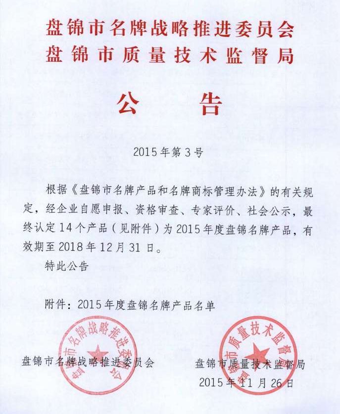 我公司產(chǎn)品——鶴福牌低煙無(wú)鹵阻燃聚烯烴護(hù)套料,通過(guò)盤(pán)錦市名牌戰(zhàn)略推進(jìn)委員會(huì)、盤(pán)錦市質(zhì)量技術(shù)監(jiān)督局評(píng)價(jià)審核,被認(rèn)定為2015年度盤(pán)錦名牌產(chǎn)品!