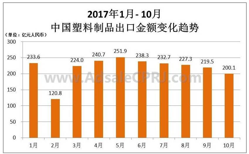 10月塑料制品出口200億元,同比微增0.76%