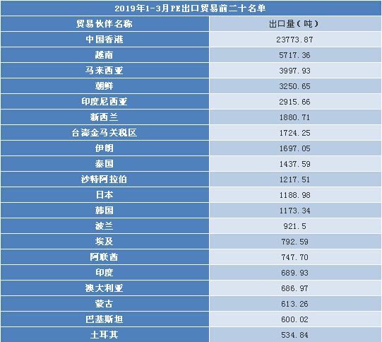 根據(jù)海關(guān)統(tǒng)計數(shù)據(jù)顯示,一季度PE市場出口量呈現(xiàn)較大幅度的增長,2019年1-3月PE共計出口6.29萬噸,比去年同期增長39.16%。出口數(shù)據(jù)呈現(xiàn)對主要市場貿(mào)易對象出口數(shù)量普遍增長以及貿(mào)易區(qū)域集中化程度高兩大特點。