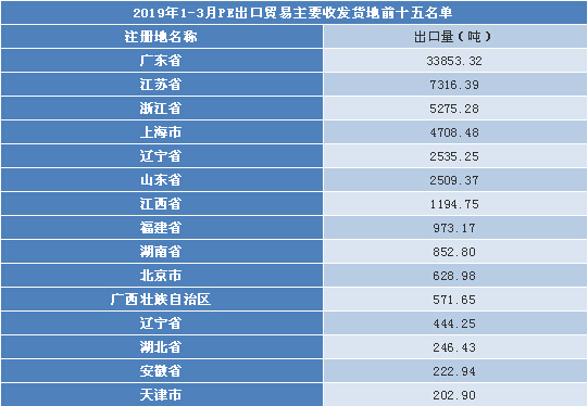 從上表可以看出,貿(mào)易區(qū)域布局集中化程度高。中國PE出口收發(fā)貨地主要集中于沿海的廣東省、江蘇省和浙江省。2019年1-3月廣東省、江蘇省、浙江省共計出口4.64萬噸,占出口總量的75.13%。具體到各省份來看,廣東省累計出口3.39萬噸,較去年同期增加45.49%;江蘇省累計出口0.73萬噸,較去年同期增加52.08%;浙江省累計出口0.53噸,較去年同期增加26.19%。